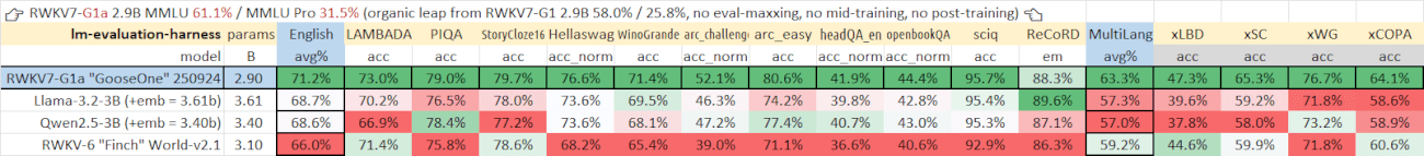 RWKV7-G1a 2.9B 的基础英语和多语言能力均强于同规模的开源模型: