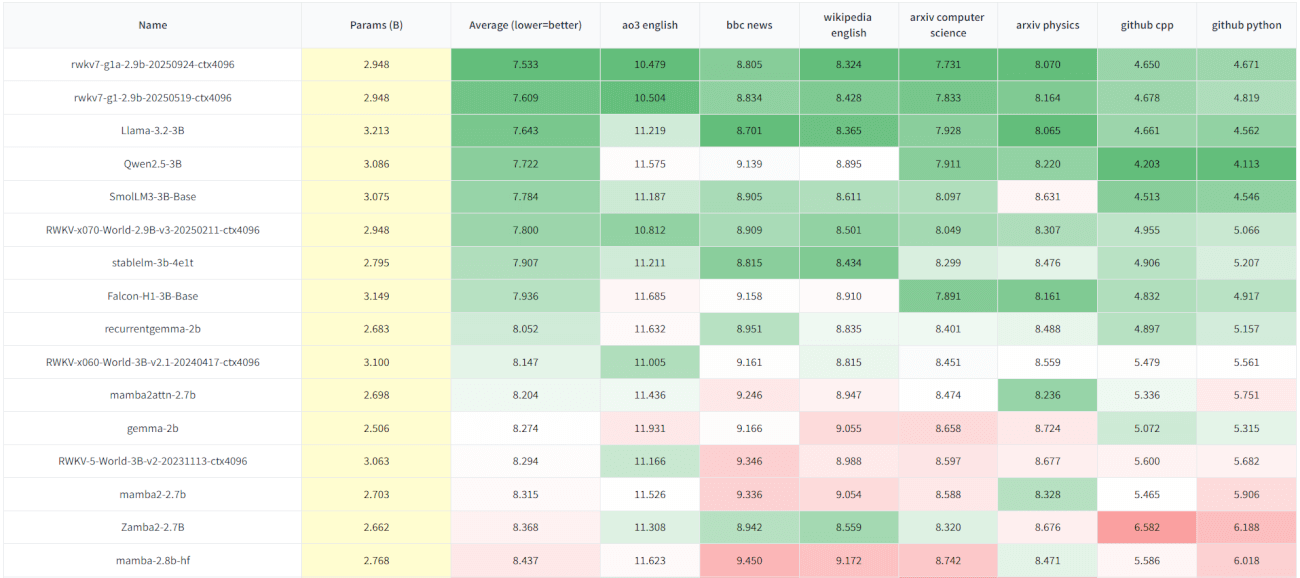 RWKV7-G1a 2.9B 的 Uncheatable Eval 继续提升,领先所有 3B 参数量开源模型。
