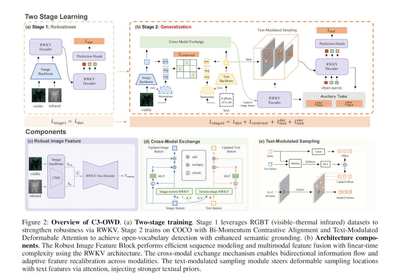 该论文基于 RWKV 架构提出 C3-OWD 框架,通过两阶段训练解决开放世界检测问题。第一阶段借助 RWKV 高效融合 RGB 与红外数据以增强模型鲁棒性;第二阶段通过视觉-语言对齐实现对新类别的泛化。该方法引入 EMA 机制防止灾难性遗忘,在鲁棒性和泛化性上均表现出色。
