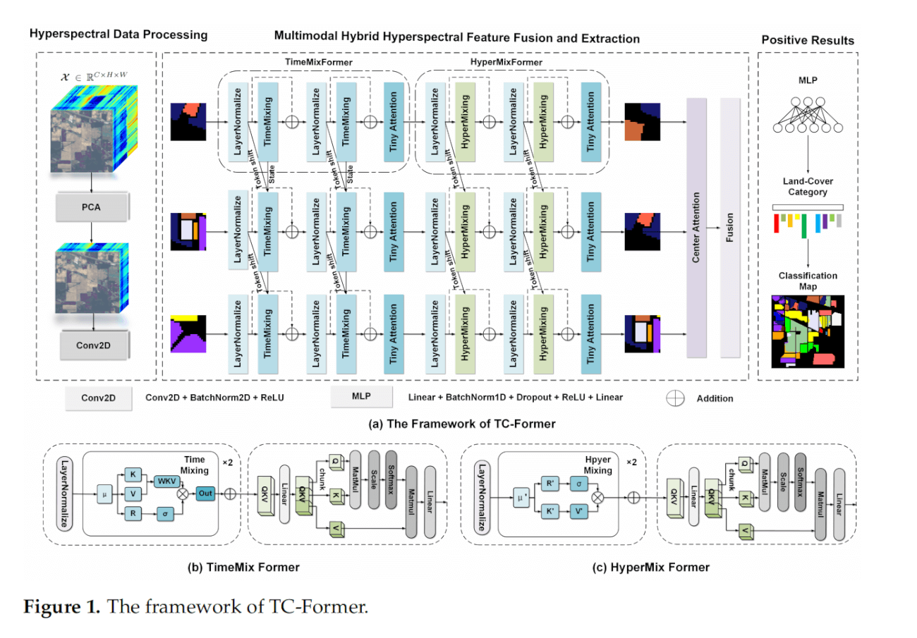 论文提出 TC-Former 框架,创新性地将 RWKV 线性注意力机制与 Transformer 结合,用于高光谱图像分类。通过 TimeMixFormer 和 HyperMixFormer 模块,该方法优化了计算复杂度,提高了长序列处理效率,同时增强了光谱特征的判别表示能力。实验结果显示,该框架在分类精度上超越了现有先进算法,显著降低了计算开销。