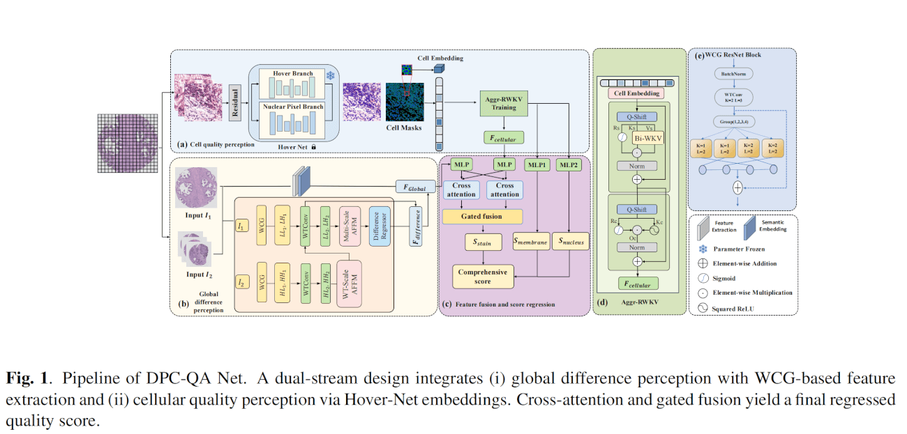 该研究提出了用于组织病理学图像质量评估的双流网络 DPC-QA Net。其核心贡献是引入 Aggr-RWKV 模块,用于聚合细胞核与细胞膜的嵌入特征以进行精细的细胞结构质量感知。该模型结合了基于小波的全局差异感知与细胞级质量评估,有效解决了宏观与微观尺度上的质量不一致问题,并在多个数据集上展示了高准确性与泛化能力。