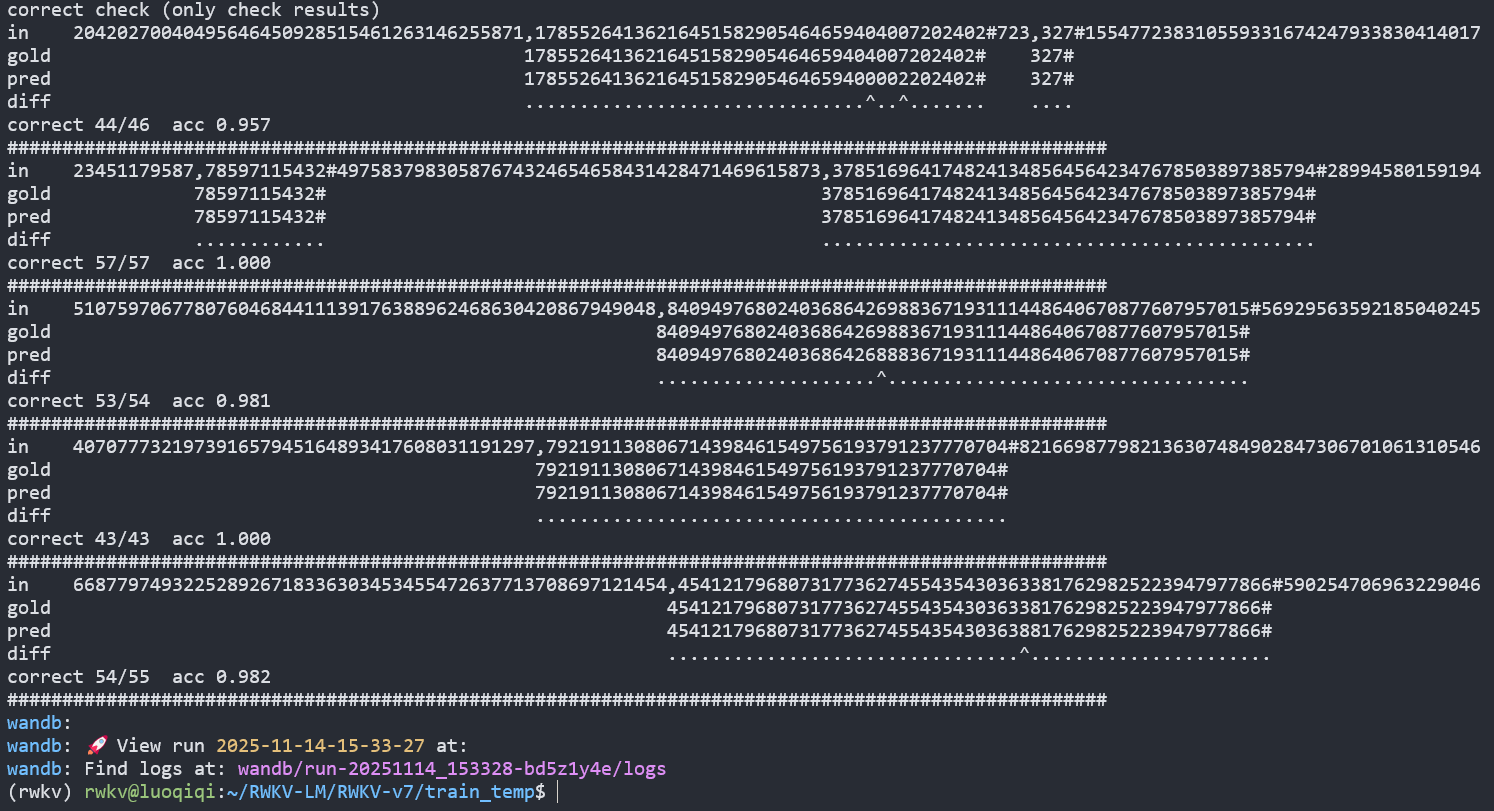 simple check是检查整个序列,对应训练时的 loss。correct check是检查“数字翻转”任务的准确率(只检查翻转后的结果是否正确)。